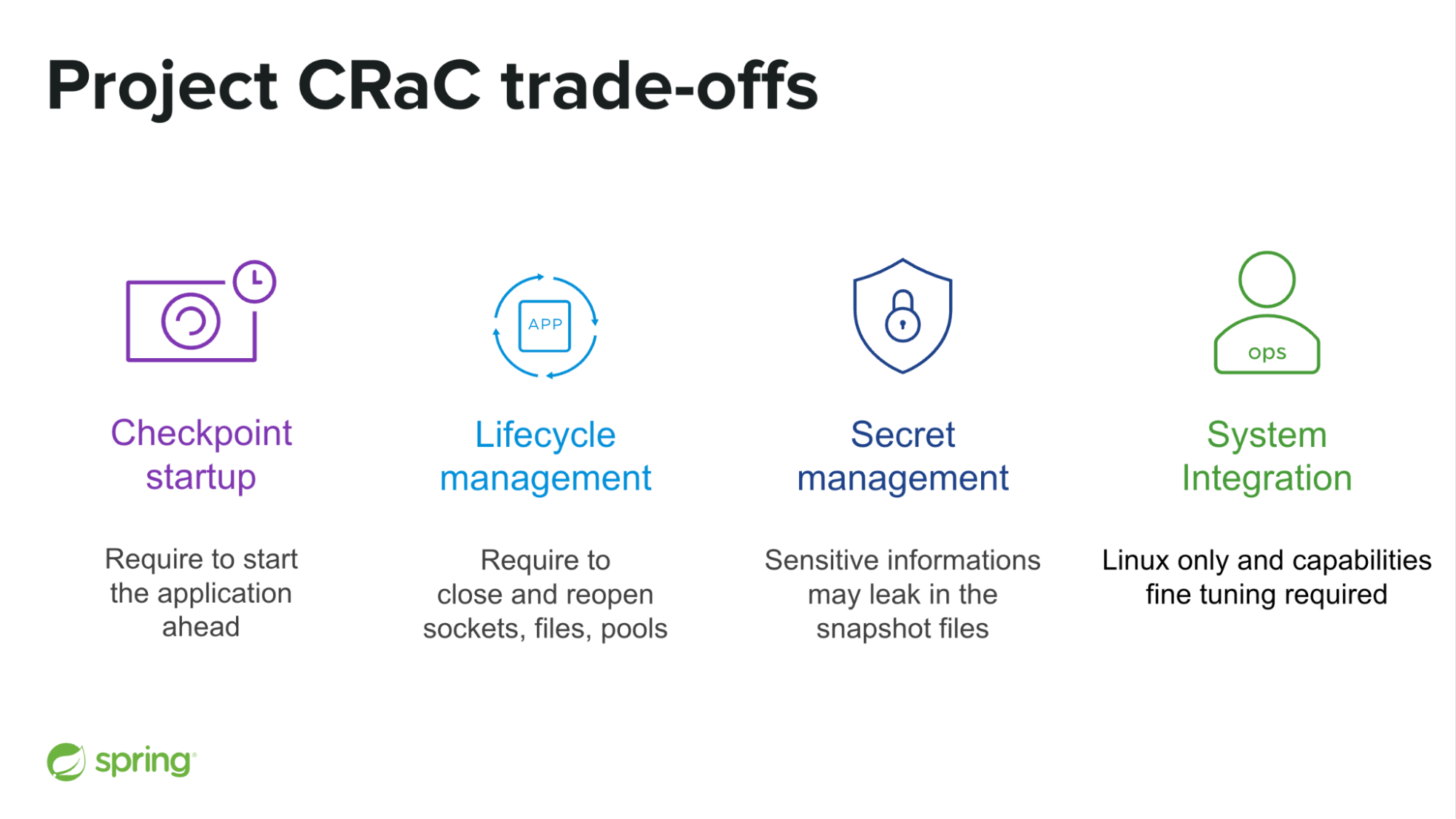 Spring Framework 6.1 CRaC지원은 주로 CRaC와 Spring 라이브 사이클을 함께 매핑하는 것이고, 나머지 지원은 CRaC에 묶여 있지 않으며 주로 소켓, 파일, 및 풀을 적정하게 닫고 재생성하도록 설계된 Spring 라이프 사이클 개선에 관한것이다.