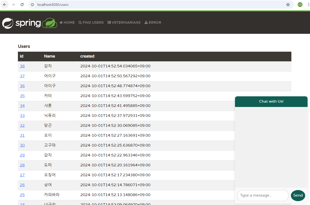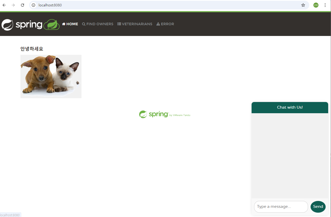 기본적인 Web 구성이 완료되면 아래와 같이 Spring Petclinic 화면과 AI와 대화를 할 수 있는 채팅 UI를 볼 수 있다.