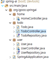 애플리케이션에서 제공하는 기능을(사용자, TODO 관리) Spring AI에서 사용할 수 있는 함수로 등록하기 위해서 java.util.function.Function 객체를 Bean으로 등록한다.