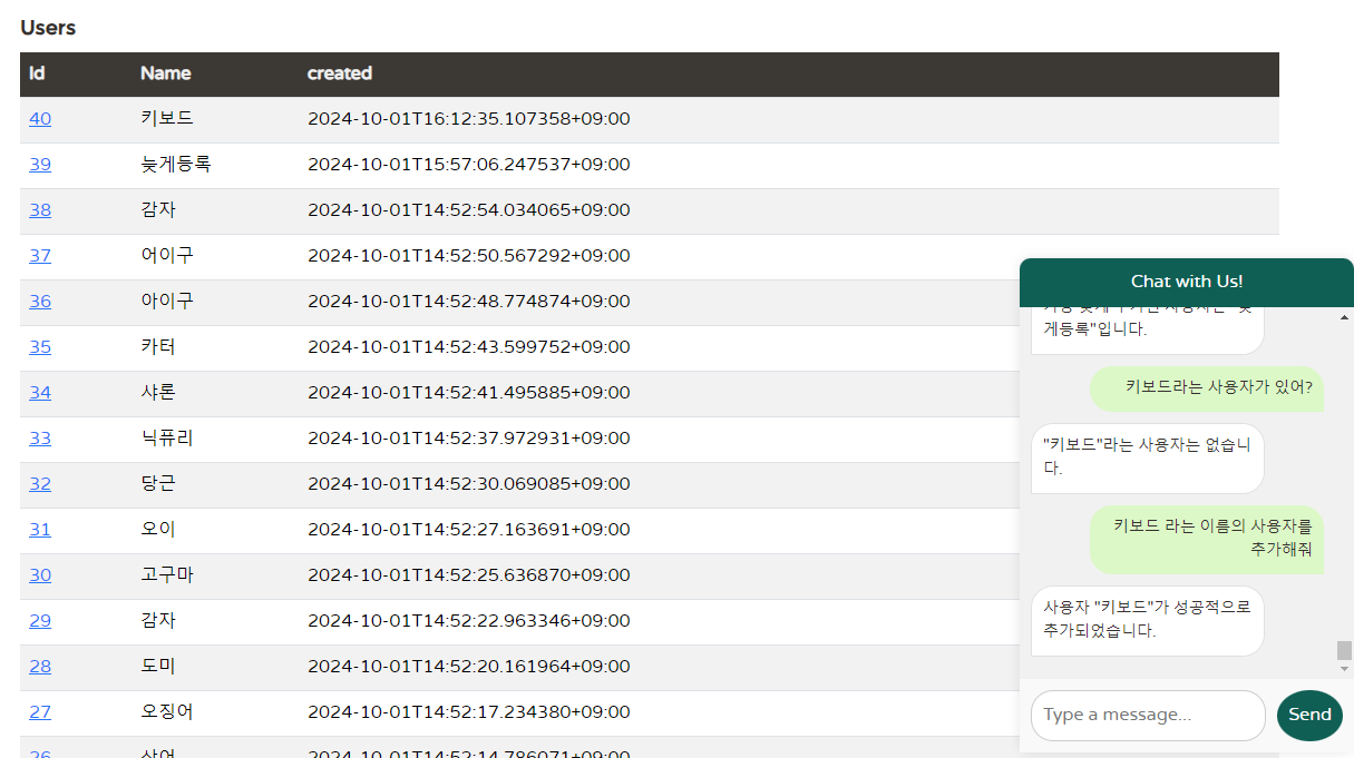 AI 어시스턴트를 사용하여 사용자를 추가해 달라고 요청하고 새로고침하면 키보드라는 사용자가 추가된 것을 볼 수 있다.