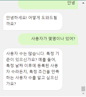- ChatClient에 시스템 텍스트를 추가한 내용처럼 사용자 수에 대한 질문은 사용자가 많다고 응답한다.
