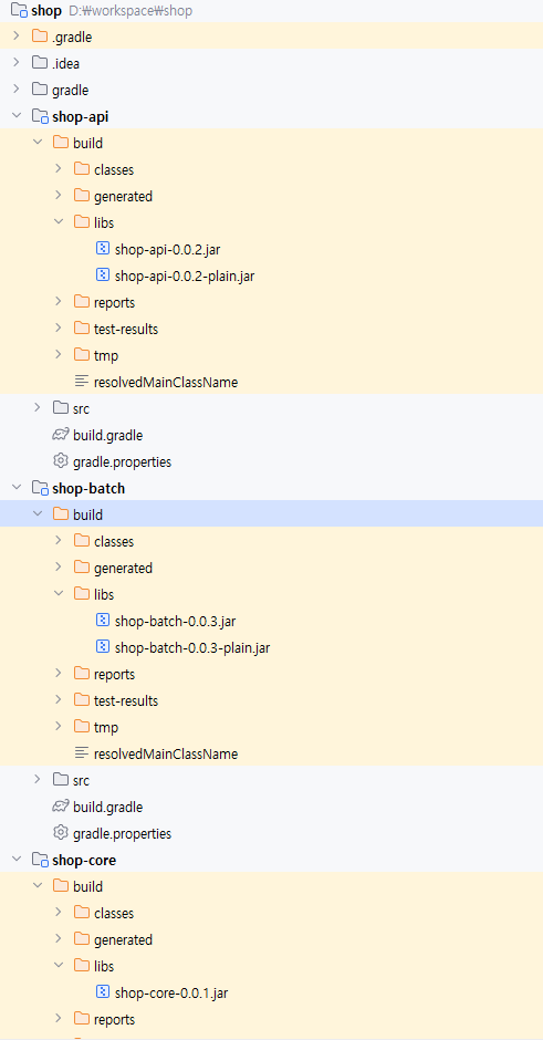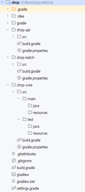 shop-core, shop-api, shop-batch 3개의 하위 프로젝트를 생성한다.