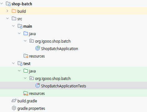 shop-batch 프로젝트는 shop-api와 동일한 구성이지만 spring-boot-starter-batch를 사용한다.