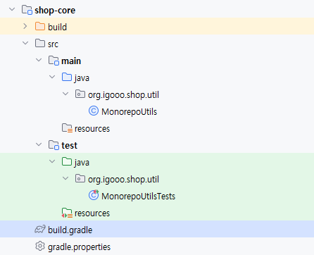 shop-core 프로젝트는 라이브러리 역할을 하며 다른 하위 프로젝트에 의존하지 않는다. 그리고 spring 의존성도 가지지 않는 java 프로젝트로만 구성할 예정이고, 예제에서 사용할 Util 클래스와 테스클래스를 추가한다.