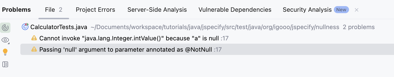 addWithNull() 메서드도 null을 설정하여 테스트에 실패하지만, null 체크에 대한 어노테이션이 지정되지 않아서 warnings에는 표시되지 않는다. (실제 서비스 코드라면 null로 호출되는 경우 NullPointerException이 발생한다.)
